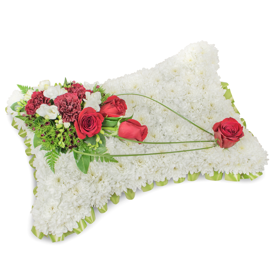 Share your sympathies with our beautiful flower arrangement, designed to offer comfort and elegance. This stunning bouquet features white chrysanthemums, bold red roses, sweet white freesias, rich dark red carnations, delicate dianthus, and soft bear grass.